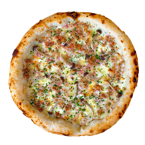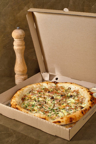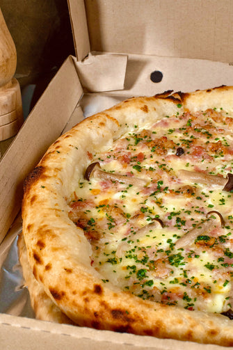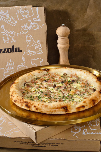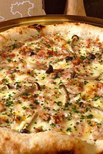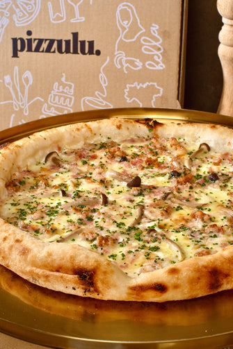 pizzulu’s original bechamel sauce, fresh mozzarella cheese, cheddar cheese, shimeji mushrooms, bacon, italian sausage, parsley, 12 brick oven pizza (good for 3 pax), *Recommended with Pizzulu's Signature Truffle Honey Sauce