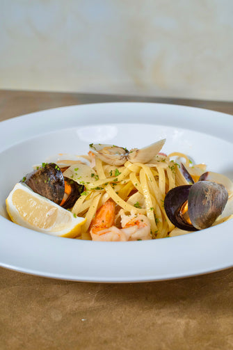 linguini pasta, olive oil,garlic, shrimp, mussels, white clams, lemon wedge