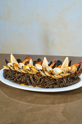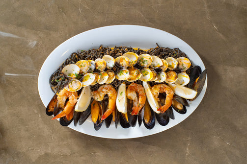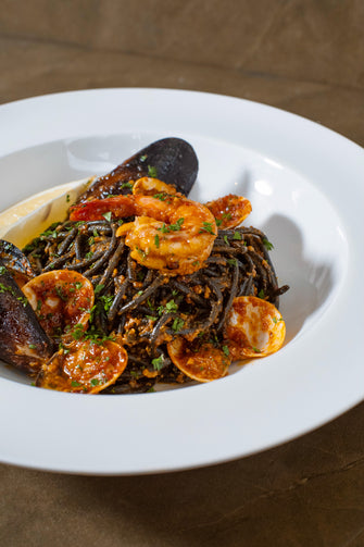 squid ink spaghetti pasta, pizzulu's original tomato sauce, shrimp, mussels, white clams, parsley