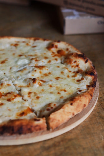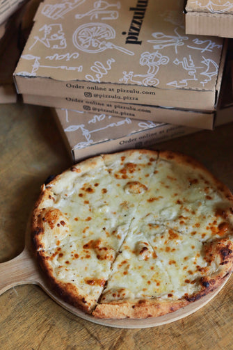 pizzulu’s original garlic cream, fresh mozzarella, mozzarella, cheddar cheese, 12" brick oven pizza (good for 3 pax), *Recommended with Pizzulu's Signature Truffle Honey Sauce
